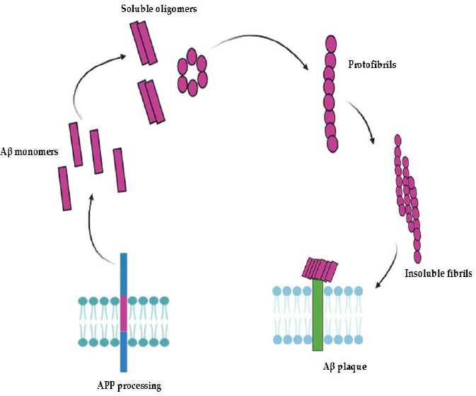 Aβ monomers combine to form oligomers, protofibrils, and amyloid fibrils, among other assemblies (Fig. 2). Whereas amyloid oligomers are soluble and can disperse throughout the brain, amyloid fibrils are larger, insoluble, and can further assemble into Aβ plaques [24]. Aβ monomers can exist as soluble oligomers capable of spreading within the brain or as large, insoluble fibrils that accumulate to form plaques. Because Aβ is involved in neurotoxicity and neuronal function, the buildup of dense plaques in the cerebral cortex and hippocampus can result in cognitive impairment, damage to axons and dendrites, synaptic loss, and stimulation of microglia and astrocytes [3].