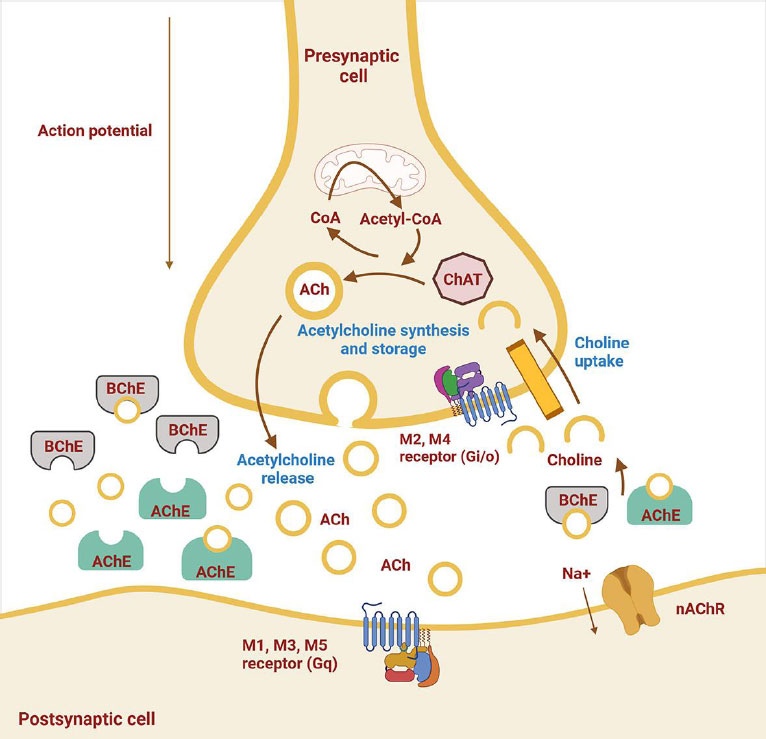 A neurotransmitter called acetylcholine (ACh), released by cholinergic neurons, plays a central role in signal transduction mechanisms related to memory and learning. The cholinergic theory—the earliest proposed explanation for Alzheimer’s disease (AD) pathophysiology—arose from observations that cholinergic neurons are involved in cognitive decline and behavioral impairments associated with AD. Abnormalities in central cholinergic function can contribute to apoptosis, neuroinflammation, aberrant tau phosphorylation, and other pathological processes [48].