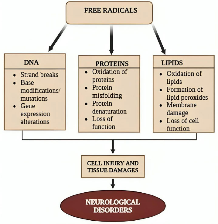 The molecular targets of free radicals and the resulting oxidative damage. This figure, adapted from [60], depicts how free radicals interact with cellular molecules, such as DNA, proteins, and lipids, leading to oxidative stress and subsequent damage to critical neuronal components [60].