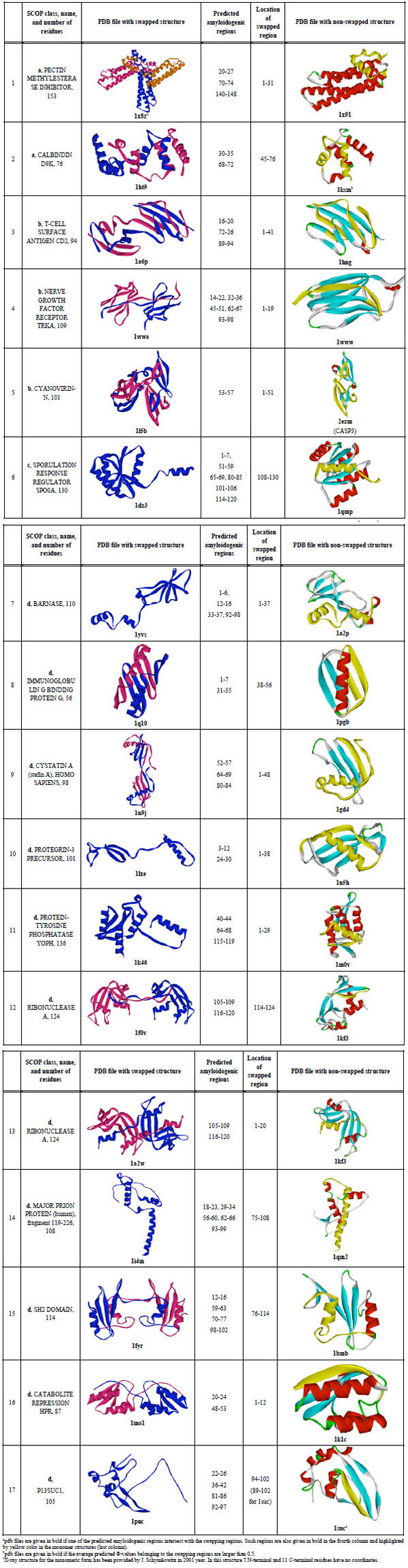 One can hypothesize that regions which are responsible for aggregation and protein folding will often appear as swapping regions in the proteins with swapped domains. For this purpose we collected 17 pairs with known 3D structures of swapped domains in the oligomeric form and 3D structures of the monomeric form.