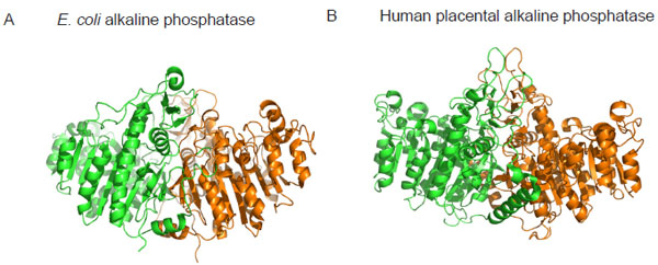 Crystal structure of alkaline phosphatase from E. coli (A) and human placenta (B) highlighting the structural similarity between bacterial and mammalian forms of the enzyme. Monomer subunits are coloured differently to highlight the dimeric nature of the enzymes. Coordinates of the structures were downloaded from http://www.rcsb.org/pdb and the images were produced using PyMOL [22]. The pdb accession numbers are ALK1 (E. coli alkaline phosphatase) and 1EW2 (human placental alkaline phosphatase).
